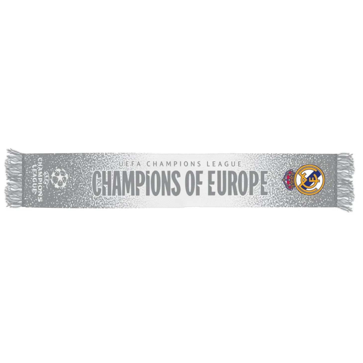KÖNIGE VON EUROPA! Feiern Sie den beispiellosen Erfolg von Real Madrid C.F. anlässlich des 15. UEFA Champions-League-Titels. Erinnern Sie sich an dieses unvergessliche Ereignis mit einem exklusiven silbernen Schal, der die neuen CL-Sieger feiert.